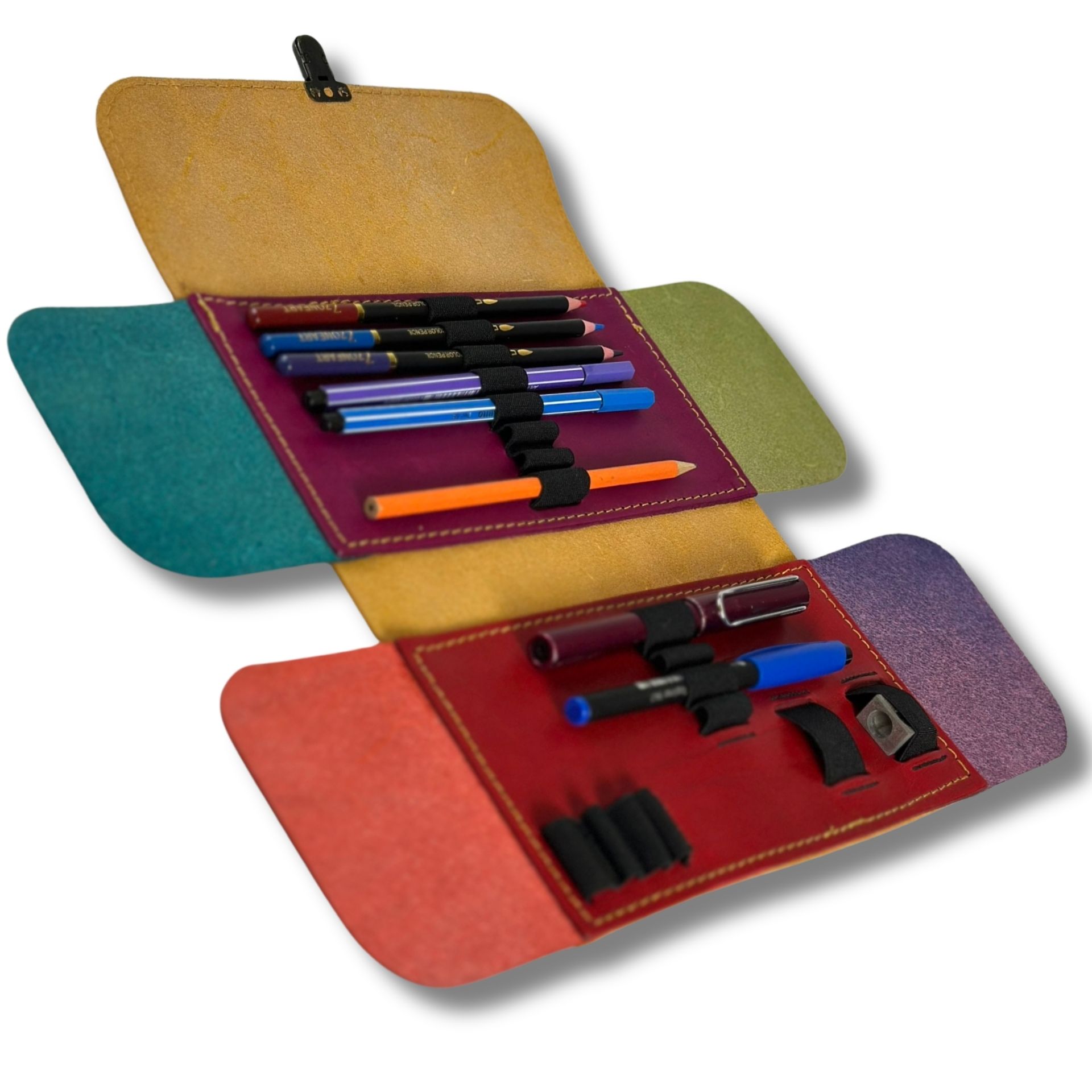 Das Mäppchen wird mit einem Steckverschluss geschlossen, die seitlichen „Ohren“ verhindern das Rausrutschen der Utensilien.